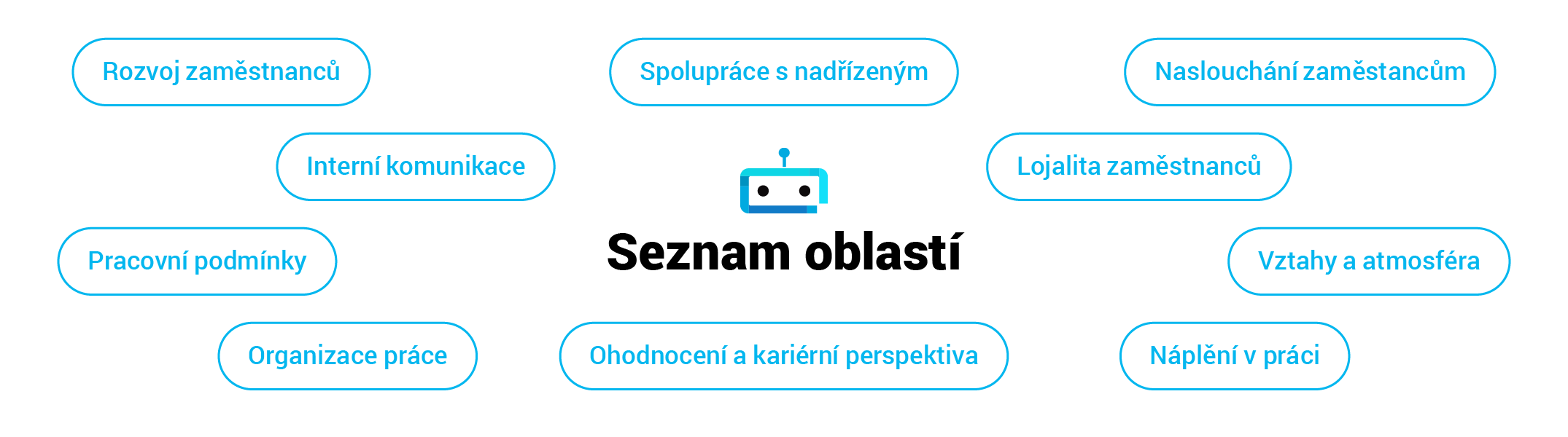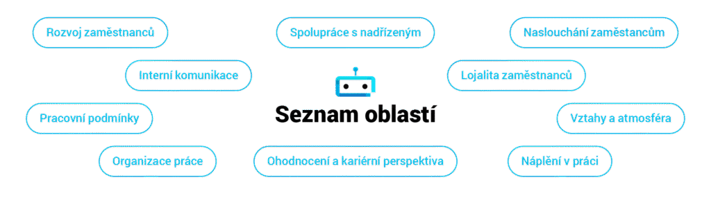 Komplexní firemní průzkum napříč klíčovými oblastmi – od firemní kultury, management až po odměňování. Výsledky uvidíte v přehledných reportech, a to za firmu, týmy i lokality. Navíc díky AI shrnutí získáte jasné priority, na které mohou navázat HR a manažeři akčními kroky.
